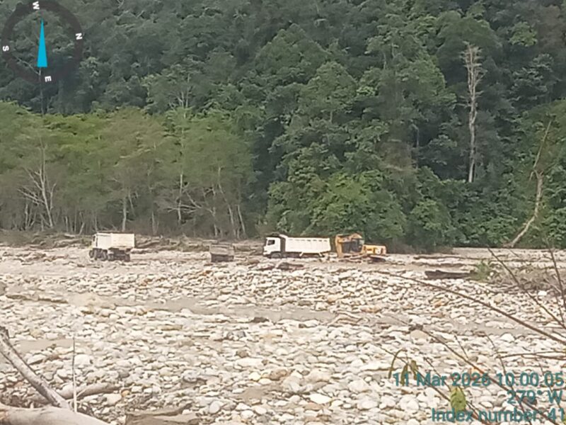 KUTACANE | Proyek rehabilitasi jalan nasional pasca bencana banjir di Kabupaten Aceh Tenggara kini menuai kecaman. Dugaan penggunaan material ilegal dalam pelaksanaan proyek ini mencuat setelah ditemukan aktivitas pengambilan batu dan kerikil dari wilayah sekitar lokasi pekerjaan, tepatnya di Ketambe, Kecamatan Ketambe. Material berupa base course yang digunakan untuk penimbunan jalan nasional tersebut diduga berasal dari galian C yang tidak memiliki izin resmi. Puluhan armada dump truk terlihat mengangkut material dari pinggiran Sungai Alas, sementara satu unit excavator tampak bebas melakukan aktivitas penambangan di lokasi tersebut pada Rabu, 11 Maret 2026.